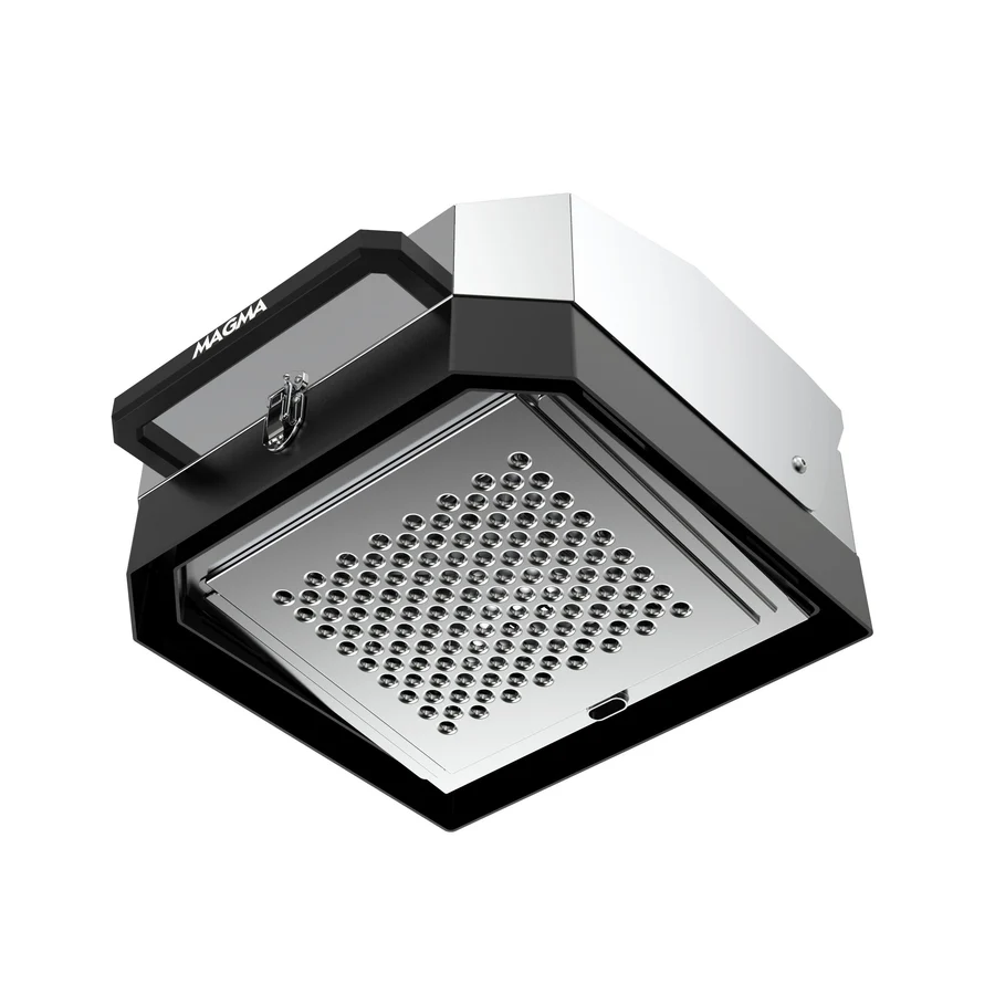 The Grill Top is made from marine grade, mirror polished stainless steel and cast aluminum base with an innovative diffuser plate for even heat across the entire cooking surface. This marine grill top cooks up the best burgers, chicken, steak, or whatever the captain can grill up while on board the boat. The cast aluminum base ensures a secure fit on the Firebox and won’t distort over time and use. The diffuser plate funnels grease away from the burner into the Firebox grease containment system and helps maintain temperature and control smoke. The lid includes a thermometer and locks into place for easy transport.