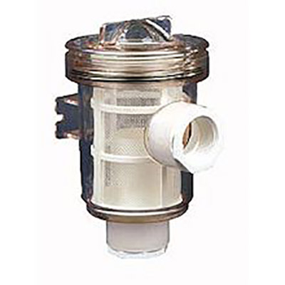 High strength clear plastic with removable fine mesh filter basket, allowing it to be easily checked for clogging. May be mounted using its own built-in bracket. Both inlet and outlet accept standard 1-1/2″ NPT adapters. Plastic fittings are required for all installations.